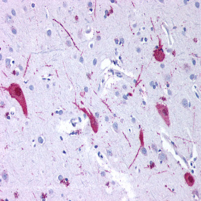 Anti-GRM4 / MGLUR4 antibody APR12300G IHC of human brain, neurons and glia. |