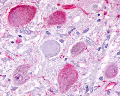 Anti-BAI3 antibody APG03124G IHC of human brain, neurons.