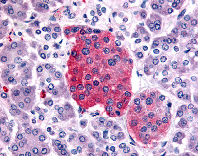 Anti-SSTR2 antibody APR10246G IHC of human pancreas, islet of Langerhans. |