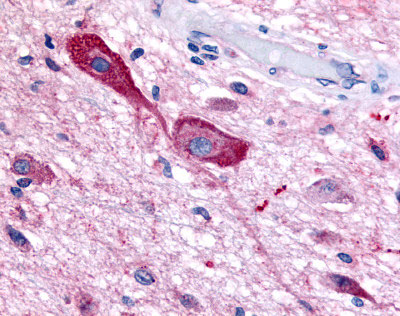 Anti-TRH Receptor antibody AMM08319G IHC of human brain, neurons and glia.
