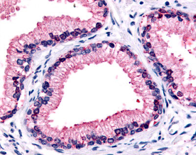 Anti-GPR87 antibody APR16630G IHC of human prostate, epithelium. |