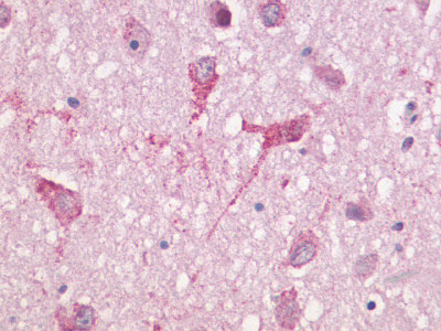Anti-GPR83 antibody AMRa00038G IHC of human brain, neurons and neuropil. |