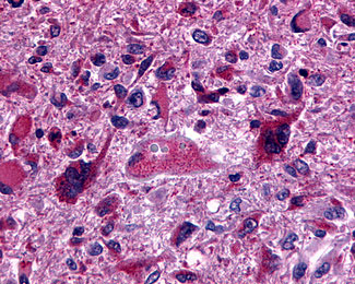 Anti-GPR162 antibody APR16521G IHC of human brain, neurons and glia. |