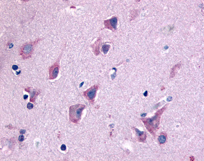 Anti-QRFPR / GPR103 antibody APR13038G IHC of human brain, neurons and glia. |