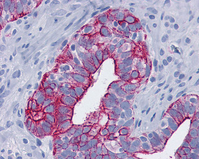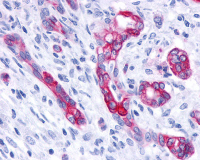 Anti-GPBAR1 / TGR5 antibody IHC of human Pancreas, Carcinoma.