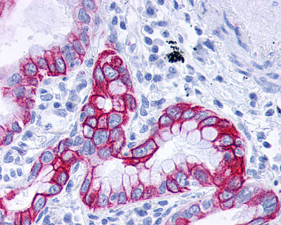 Anti-GPBAR1 / TGR5 antibody IHC of human Lung, Adenocarcinoma. |