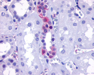Anti-GPR110 antibody AMM05557G IHC of human kidney, renal tubules. |