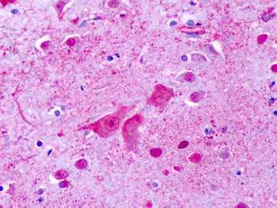 Anti-GPR137 antibody IHC of human brain, cortex, cerebellum. |