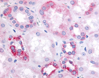 Anti-GPR91 antibody AMM08051G IHC of human kidney, renal tubular epithelium in cortex. |