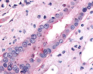 Anti-SLC5A2 antibody APR10132G IHC of human kidney, collecting duct. |