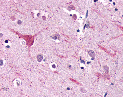 Anti-NPFFR2 antibody AMM06779G IHC of human brain, neurons and glia. |