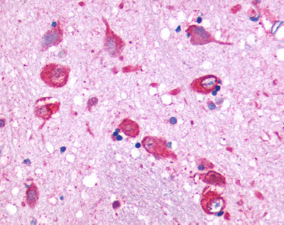 Anti-GPR150 antibody APR16503G IHC of human brain, neurons and glia. |