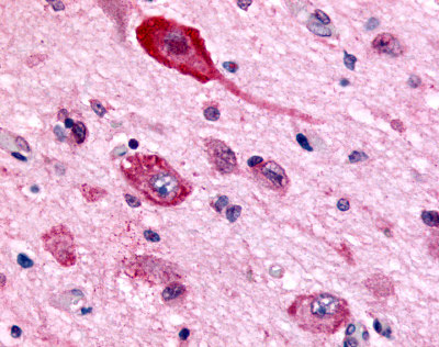 Anti-GABBR1 antibody APG03309G IHC of human brain, neurons and glia. |