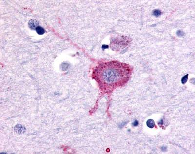 Anti-GRM2 / MGLUR2 antibody APR12289G IHC of human brain, neurons and glia. |