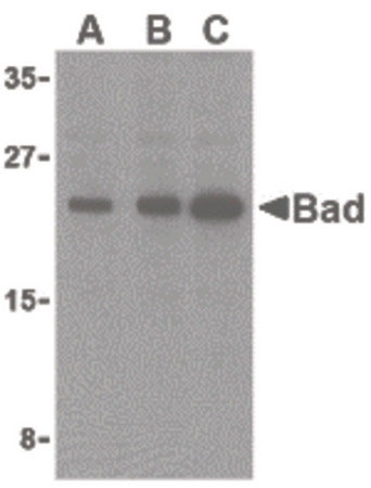 Western blot of Bad in T24 cell lysates with Bad antibody at (A) 0.5, (B) 1, and (C) 2 ug/ml.
