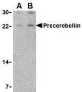 Western blot of precerebellin in mouse cerebellum lysate with APR11566G at (A) 2 and (B) 4 ug/ml.