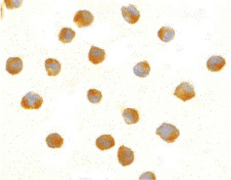 Immunocytochemistry of DFF40 in Jurkat cells with DFF40 antibody at 5 ug/ml.