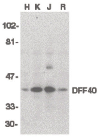 Western blot of DFF40 in HeLa (H), K562 (K), Jurkat (J), and Raji (R) whole cell lysate with...