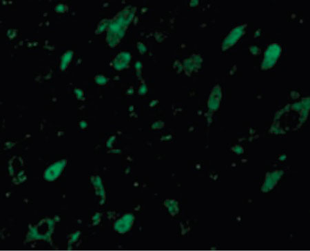 Immunofluorescence of GBL in Mouse Brain cells with GBL antibody at 10 ug/ml.