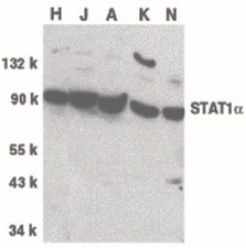 Western blot of STAT1 alpha in whole cell lysates from HeLa (H), Jurkat (J), A431 (A), K562 (K),...