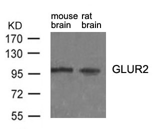 Western blot of extracts from mouse brain and rat brain tissue using GluR2 (Ab-880) antibody. |