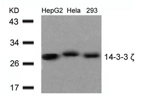 Western blot of extracts from HepG2 , HeLa and 293 cells using 14-3-3z(Ab-58) antibody.