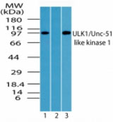 Western blot of ULK1 in Raji cell lysate in the 1) absence, 2) presence of immunizing peptide... |
