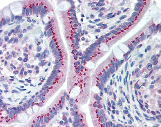 Anti-GOLM1 / GOLPH2 antibody IHC of human small intestine. |