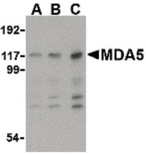 Western blot of MDA5 in Daudi cell lysate with MDA5 antibody at (A) 1, (B) 2 and (C) 4 ug/ml.