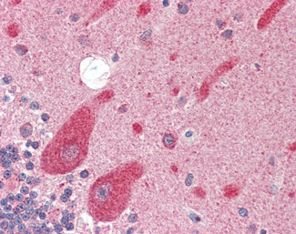 Immunofluorescence of Grik4 in Human Brain cells with Grik4 antibody at 20 ug/ml.