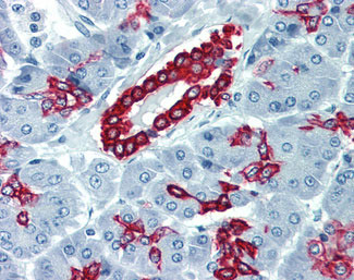 Anti-Cytokeratin 19 antibody IHC of human pancreas.