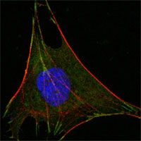 Confocal immunofluorescence of L-02 cells using GPI mouse monoclonal antibody (green). |