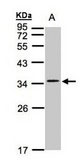 Sample(30 ug whole cell lysate). A: Hep G2. 12% SDS PAGE. CACNG5 antibody diluted at 1:1000. |