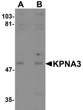 Western blot analysis of KPNA3 in EL4 cell lysate with KPNA3 antibody at (A) 1 and (B) 2 ug/ml. |