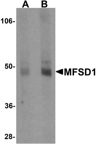 Western blot analysis of MFSD1 in human lung tissue lysate with MFSD1 antibody at (A) 1 and (B)...