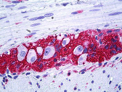 Anti-CD56 antibody IHC of human intestine, ganglion cells. |