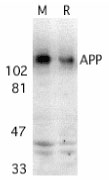Western blot of APP in mouse (M) and rat (R) brain tissue lysates with APP antibody at 2 ug/ml.