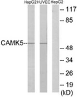 Western blot of extracts from HepG2/HUVEC cells, using CAMK5 Antibody.