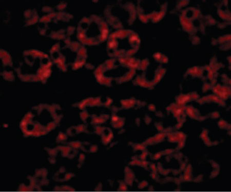 Immunofluorescence of NPC1 in Mouse Kidney cells with NPC1 antibody at 20 ug/ml.