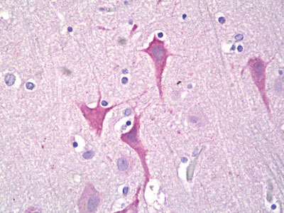 Anti-PKC Mu antibody IHC of human brain, cortex neurons. |