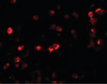 Immunofluorescence of OGFOD1 in Daudi cells with OGFOD1 antibody at 20 ug/ml.