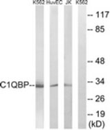 Western blot of extracts from Jurkat/HUVEC/K562 cells, using C1QBP Antibody.