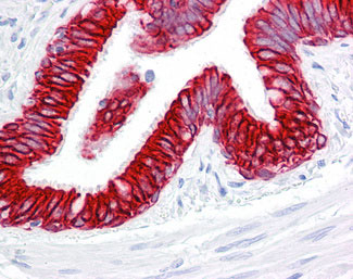 Reacts exclusively with cytokeratin 19 which is present in glandular-type epithelia and most carcinomas. Does not react with hepatocytes and hepatocellular carcinoma.