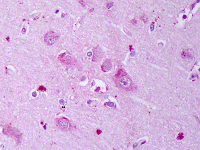 Anti-GABRB1 antibody IHC of human brain, cortex neurons. |