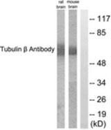 Western blot of extracts from mouse brain/rat brain cells, using Tubulin beta Antibody.