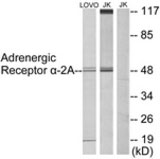 Western blot of extracts from Jurkat/LOVO cells, using Adrenergic Receptor alpha-2A Antibody.