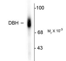 Western blot of human adrenal medulla lysate showing specific immunolabeling of the ~75k DBH...