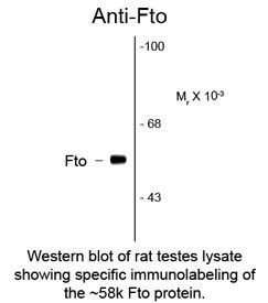 Specific for the ~58 kDa Fto protein in Western blots of rat testes lysate. The antibody has also been used for immunocytochemistry with neuronal progenitor cells.