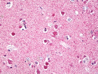 Anti-RPS6KA5 / MSK1 antibody IHC of human brain, cortex neurons. |