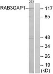 Western blot of extracts from 293 cells, using RAB3GAP1 Antibody. |